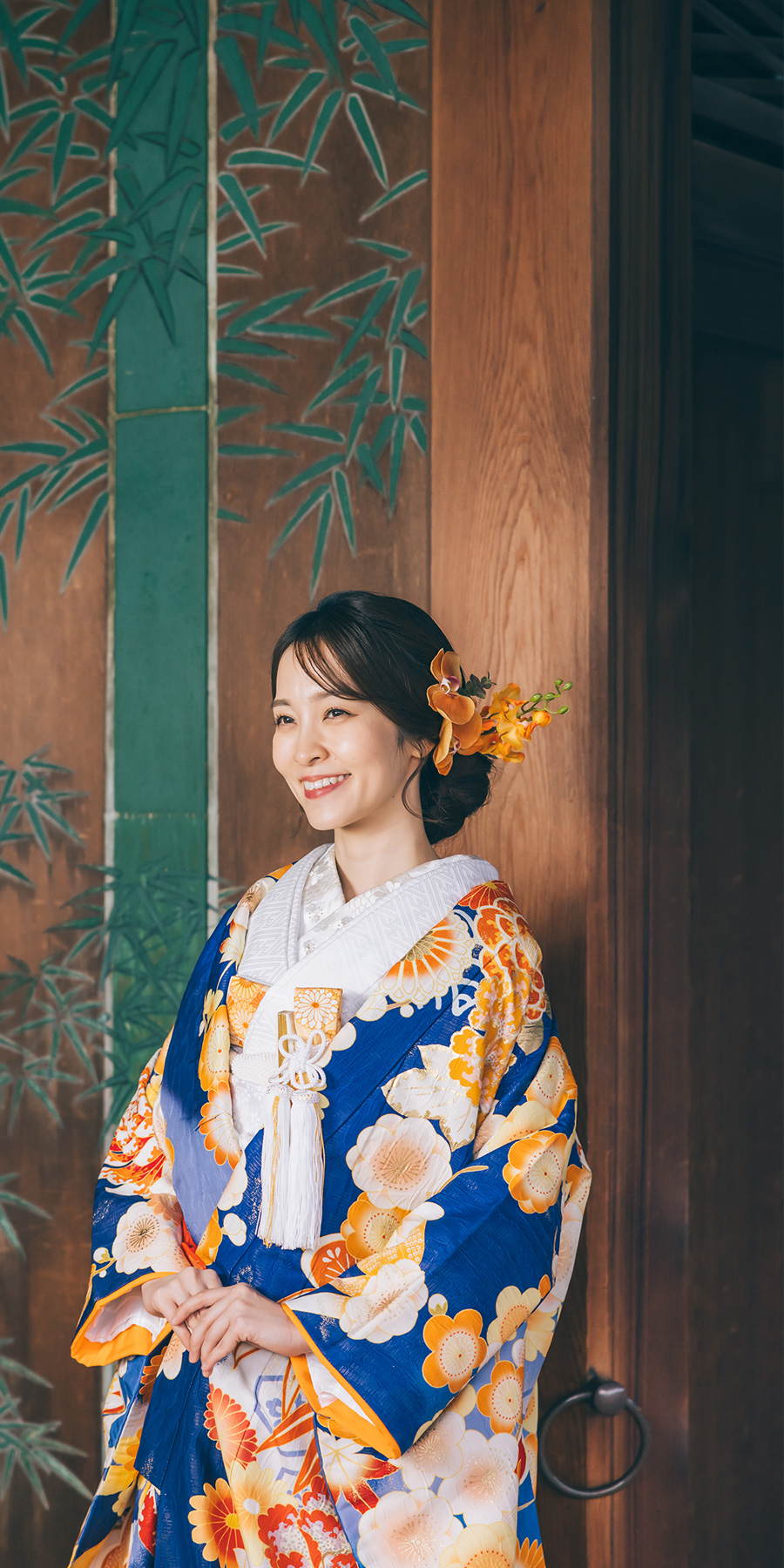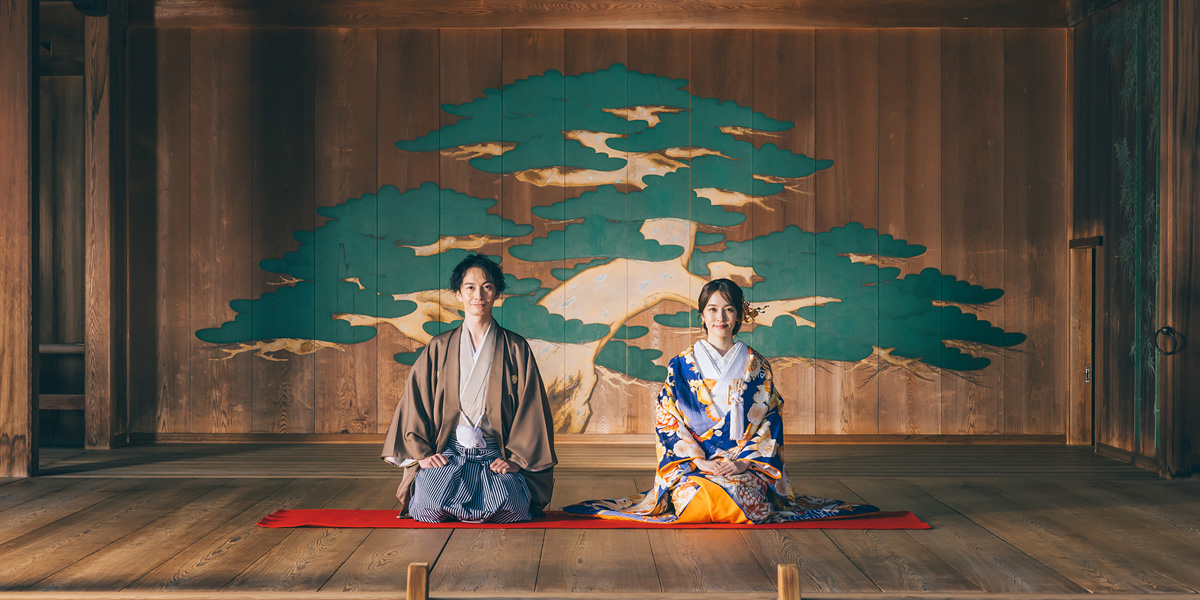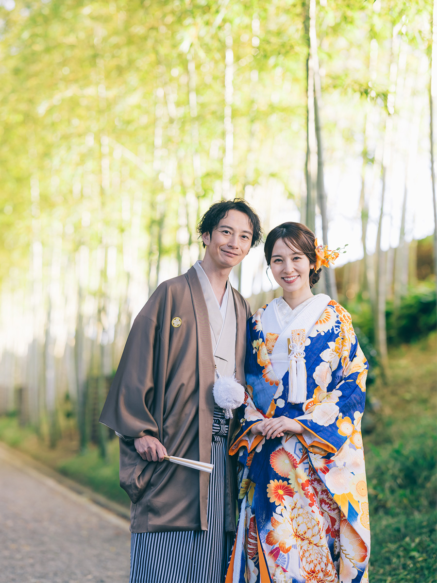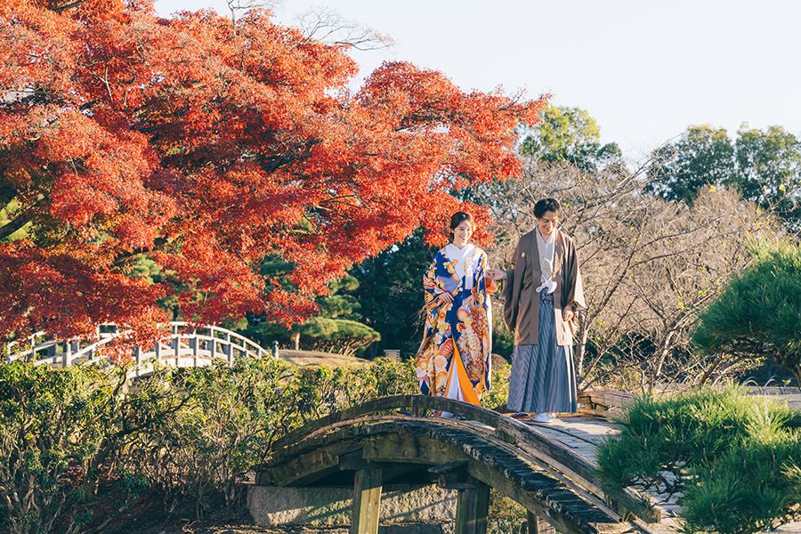 日本庭園を散歩するようにゆったり100カット以上撮影します。壮大な太鼓橋や京都嵯峨野を思わせる立派な竹林など魅力的な撮影スポットが満載。オプションで能楽堂での撮影も可能です。